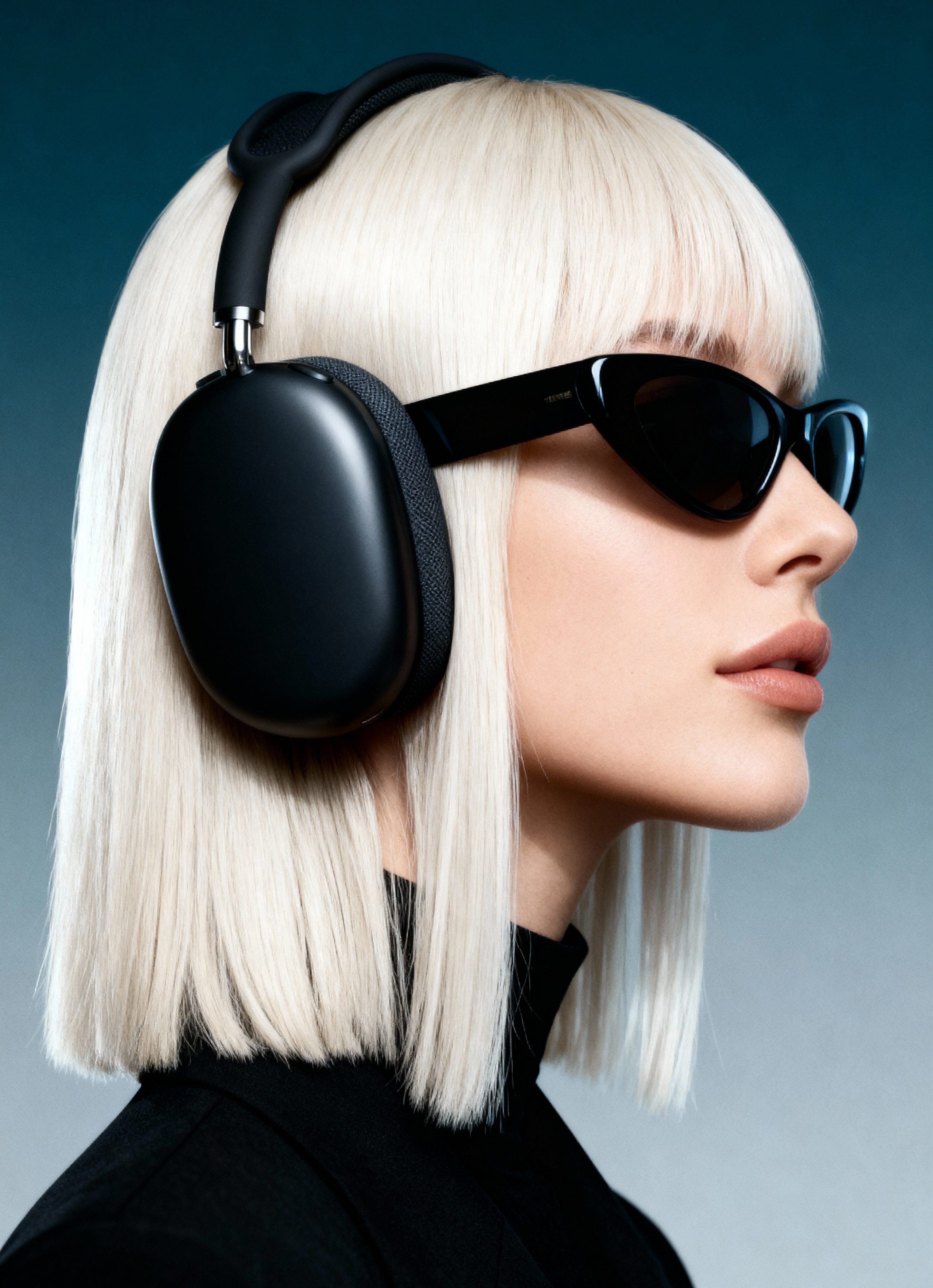 Modern minimalist portrait featuring premium wireless headphones and sleek sunglasses against a gradient teal background.